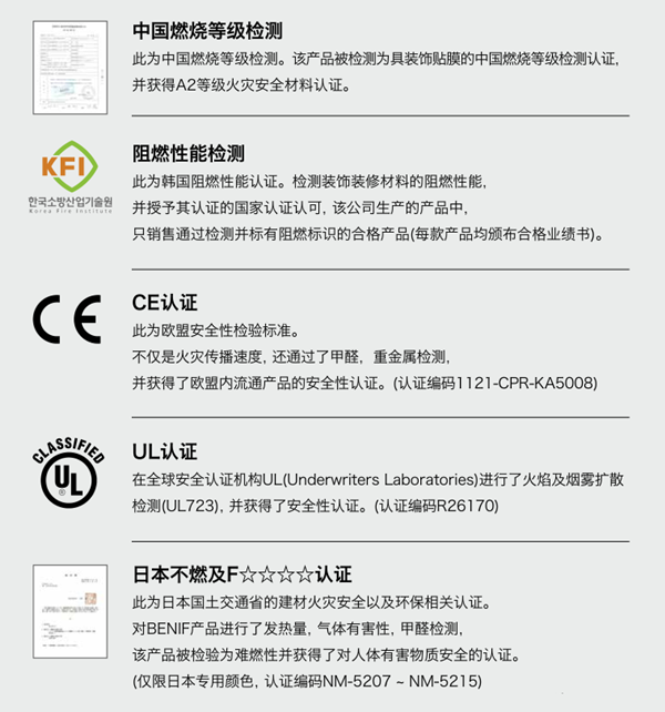 LX HAUSYS自粘性裝飾貼膜為了在發(fā)生火災(zāi)時(shí),能保護(hù)顧客的生命及安全,通過了國內(nèi)及海外火災(zāi)安全認(rèn)證檢測(cè)并獲得了產(chǎn)品安全性認(rèn)證。