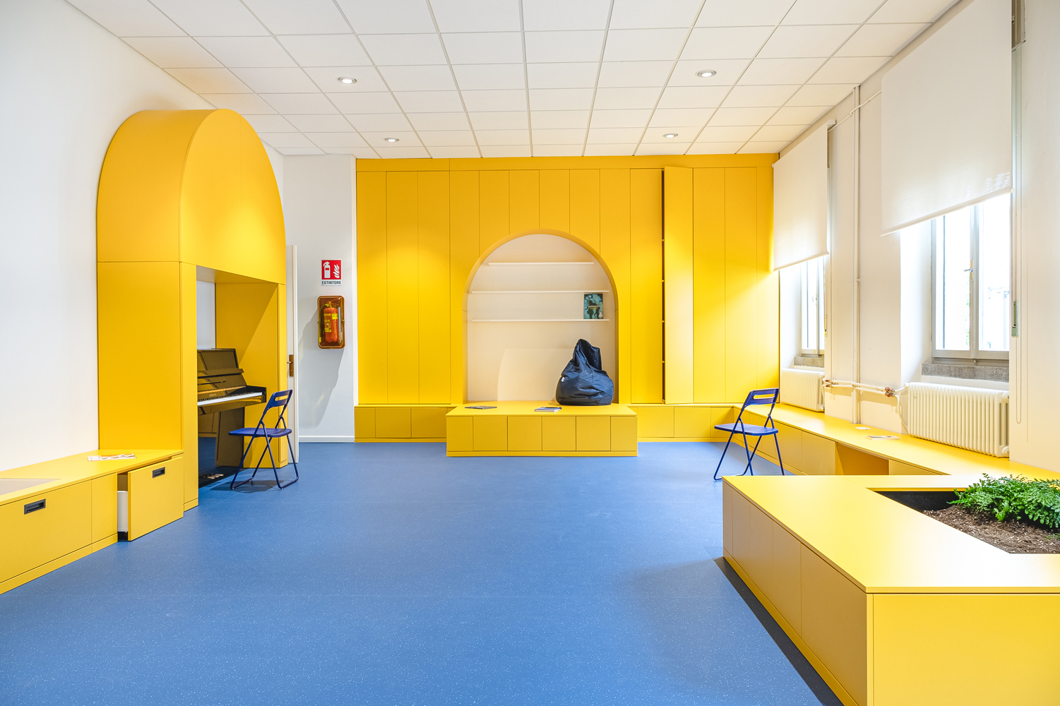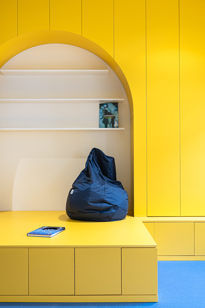 柜體整體使用明黃色的裝飾貼膜,地面則選用了海藍色的塑膠地板。整個空間充滿了創意與想象空間。
